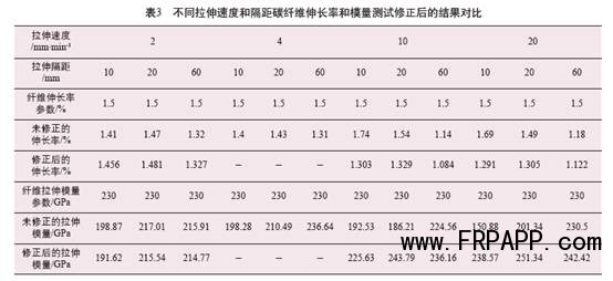 最后可以根據線性回歸后的分析結果,對測試讀出的數據進行修正。將系統受力產生的伸長量剔除,得到碳纖維真正的伸長率和模量等力學指標,見表3。