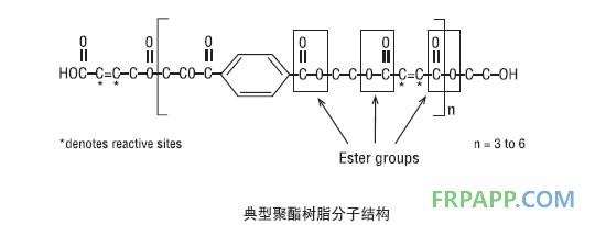 下圖表明了聚酯樹脂的典型分子結構,表明了酯基和活潑雙鍵在分子鏈中的位置。