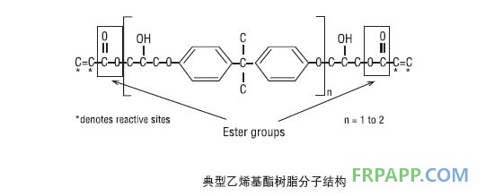 下圖顯示了乙烯基酯樹脂的典型分子結構,表明了酯基和活性基團的位置。
