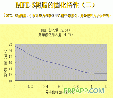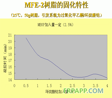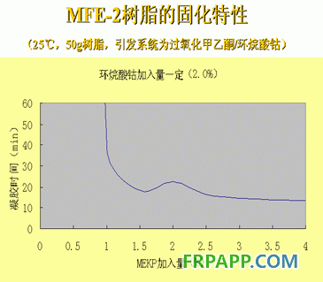 乙烯基酯樹脂的常溫固化性能優異,能滿足現場復雜天氣條件下的施工要求。下面以MFE-2、MFE-5為例說明。 (注:以下實驗所用的過氧化甲乙酮活性氧含量為10%,環烷酸鈷的鈷含量為0.8%。 )