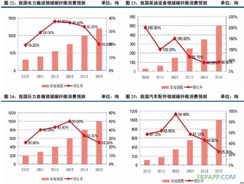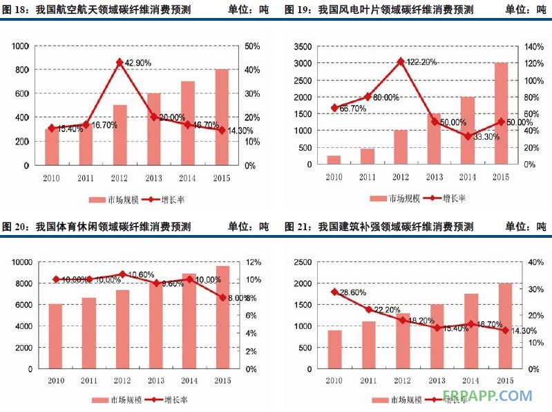 風電葉片領域:國家政策鼓勵及推動風力發電快速發展的規劃相繼出臺,該領域的消費將會成倍增長,割據規劃,到2020 年我國風機葉片市場對CF 的需求量將達到萬噸級水平。