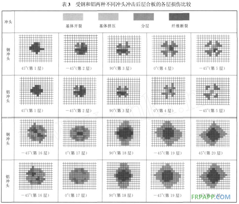 不同材料的沖頭沖擊時,沖頭與層合板接觸分析的相關數據見表4(沖擊能量為5.9J)。從表4可以看出,雖然兩種沖頭與層合板開始接觸的時間是一致的,但是與鋁沖頭相比,鋼沖頭開始反彈的時間要早一些,即鋼沖頭與層合板的總接觸時間比鋁沖頭與層合板的接觸時間要短,且鋼沖頭的最大位移要大于鋁沖頭的最大位移。