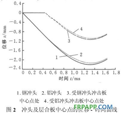 圖2所示為受不同材料的沖頭沖擊時,沖頭的位移-時間曲線及層合板正中心受沖擊點處的位移-時間曲線,位移取沿層合板上表面的外法線方向為正。從圖2中可以看出,無論是沖頭的最大位移還是板中心處的最大位移,鋼沖頭的都要大于鋁沖頭的。通過比較鋼和鋁的性能可以看出,沖擊物越硬,層合板的變形就越大。