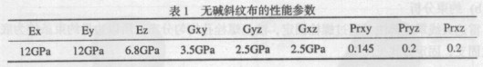 無堿斜紋布是正交各向異性材料,具有9個獨立的材料參數(shù),根據(jù)實驗測試結(jié)果,其材料參數(shù)如表1所示。