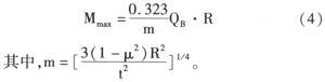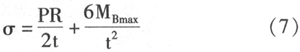 其中,D為彎曲剛度,D=Et3/12。當P=4.5MPa時,按此計算,在根部附近最大應力為軸向應力σ1=66MPa,周向應力σ2=105MPa。