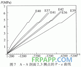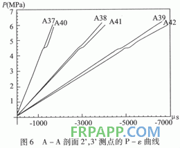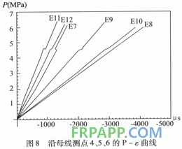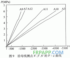 沿天線罩母線上外壁的測點4、5、6兩個互相垂直方向的P-ε曲線如圖8所示。內壁測點4’、5’6’各方向的P-ε曲線如圖9所示。