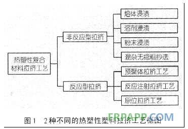 由于熱塑性樹脂融體的黏度大, 浸漬困難,因而改進(jìn)研究工作的關(guān)鍵點(diǎn)集中在浸漬技術(shù)方面,而不同拉擠工藝的根本區(qū)別也就在浸漬方法和浸漬工藝的差異上。通常,根據(jù)浸漬技術(shù)可把熱塑性復(fù)合材料拉擠工藝分為非反應(yīng)型拉擠工藝和反應(yīng)拉擠工藝兩大類。從目前應(yīng)用情況來看,非反應(yīng)型工藝占主體,應(yīng)用較為廣泛,相對來講也比較成熟[ 3 ] 。圖1 是采用2 種不同方式的熱塑性復(fù)合材料拉擠工藝示意圖[ 4 ] 。