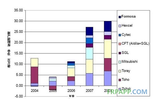 圖2. 主要碳纖維產不同年份新產能的增加〔2〕