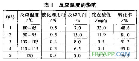 由表 1可以看出,隨著溫度升高,反應速度明顯地加快。因為溫度升高,一方面分子的碰撞幾率增大,另一方面體系的粘度下降,有利于分子的接觸和碰撞 ,從而反應速度加快,故要提高反應的速度應盡可能地升高反應溫度。但若將反應溫度cnfrp.net升得過高,則會產(chǎn)生凝膠,反應溫度以 120℃為宜。