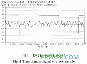 試驗(yàn)機(jī)用來對裂紋試樣加壓,壓力信號由載荷傳感器拾取,再由數(shù)據(jù)采集儀的通道2采集轉(zhuǎn)換后送入電腦。試驗(yàn)機(jī)加壓的同時依然用信號發(fā)生器發(fā)出持續(xù)的方波信號,通過壓電激振器在復(fù)合材料構(gòu)件內(nèi)產(chǎn)生振動信號,其響應(yīng)由壓電傳感器測取后經(jīng)數(shù)據(jù)采集儀的通道1送入電腦。