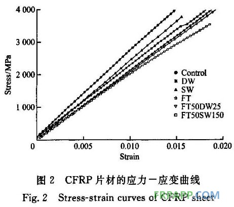 多因素耦合作用的結(jié)果并不是各因素單獨(dú)作用結(jié)果的簡(jiǎn)單疊加,而是各因素相互影響的結(jié)果。但是經(jīng)過各因素耦合作用后,CFRP的應(yīng)力-應(yīng)變關(guān)系基本呈線性關(guān)系(見圖2)。