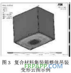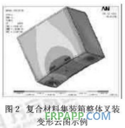 大型結(jié)構(gòu)化通用程序ANSYS中,包括復(fù)合材料單元,集裝箱設(shè)計(jì)所采用的層合板單元,在該程序中也能夠應(yīng)用,這使得力學(xué)分析工作大大簡(jiǎn)化,為復(fù)合材料集裝箱優(yōu)化設(shè)計(jì)工作,提供了較好的設(shè)計(jì)平臺(tái)。圖2為用ANSYS分析得到的復(fù)合材料集裝箱整體叉裝變形云圖。圖3為該集裝箱的整體吊裝變形云圖。此外還可以得到其應(yīng)力云圖,由于篇幅原因,不再列舉。