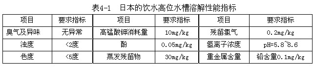 從具體的產品標準來說,主要是針對某一種已定型的產品,如對圓筒形葡萄酒貯罐、啤酒運輸罐、冷凍魚、肉類庫房壁板、水果貯倉、飲用水箱、糧倉等,應分別制訂標準。例如日本JIS標準對高位水槽的性能,除規定了各項機械強度、彈性模量;硬度、吸水率等指標外,又具體規定了飲用水的溶解性能指標(見表13-2)。日本對試驗方法也有明確規定,例如蒸發殘留物的測定方法是:首先把表面積為60cm2的試樣(全部表面用和水槽內表面相同的樹脂制造)水洗1h,然后浸泡在含殘留氯約2%的1L自來水中,在不與外部通氣的暗處,于(20±2)℃下放置6h。把浸過試樣的水與未經浸泡試樣的水對比檢驗,采用蒸發干燥法測定兩者殘留物的重量差,即得蒸發殘留物值。表4-1中規定為30mg/kg,這是相當嚴格的。