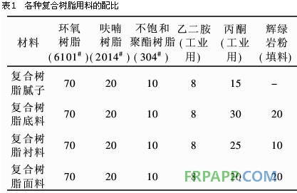 (1)各種復合樹脂用料的配比(質量比)見表1。