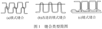 縫合工藝使用碳、玻璃、Kevlar做成的縫合線在工業縫紉機上對織物進行厚度方向的縫合。縫線僅占復合材料纖維體積含量的百分之幾。目前芳綸纖維由于其特殊的耐磨性、良好的抗沖擊韌性和較低的纖維密度,在縫合過程中得到廣泛應用。鎖式縫合和鏈式縫合[6,7]是縫合線跡的兩種基本型式,如圖1所示。鎖式縫合會在面紗與底紗之間形成兩個縫合線圈,在織物中間相交,產生應力集中;點改進的鎖式縫合可以穿過織物厚度,提高分層韌性和損傷容限,因此使用較多;鏈式縫合類似于針織,縫合線多次撓曲,操作復雜,使用較少。