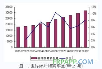 可以明顯看出,航空航天領域需求量有大幅度增加。2001 年航空航天領域對碳纖維的需求為2690t,2002 年和2003 年對碳纖維的需求量有所減少,2002 年約減少20%,2003 年則減少約9 %。2003 年以后航空航天領域對碳纖維的需求出現快速增長,2006 年與2001 年相比 將增長約40 %,2008 年將增長約76 %,到2010 年和2001 年相比預計增長超過100%。本文將介紹碳纖維增強樹脂基復合材料(CFRP)在航空航天領域應用的新進展。