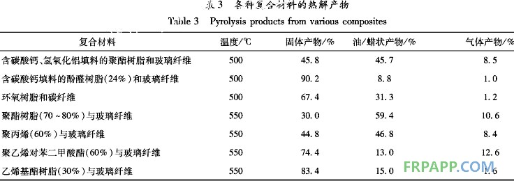 利茲大學的研究工作涉及350~800℃溫度范圍內的復合材料的熱解。研究的復合材料包括:聚酯、乙烯基酯、環氧、酚醛熱固性樹脂,和聚丙燃、聚乙烯、對苯二甲酸酯熱塑性塑料,采用的是玻璃纖維和碳纖維增強材料和碳酸鈣填料。研究的熱解是在固定的反應器中抽真空的情況下對復合材料進行加熱。表3列出了材料對比和500℃、550℃下熱解的產品。聚酯樹脂在450℃下完全分解,其它樹脂完全分解溫度更高,達到500~550℃。一般復合材料產生1~10%的氣體產品,二氧化碳占主要部分,但可燃性氣體產品的熱值不少于18MJ/kg,但環氧復合材料放出的氣體富含甲烷,聚丙烯熱塑性復合材料放出的氣體含有單體丙烯。這些氣體產品的熱值在42MJ/kg到44MJ/kg之間。