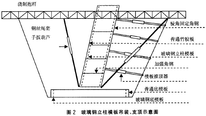 先在玻璃鋼底模板上進行鋼筋綁扎,然后將制作好的玻璃鋼立柱模板套于基礎立柱鋼筋外,底板筋上方采用角鋼拖帶的方法,臨時將玻璃鋼模板筒固定在基礎立柱鋼筋外,再將基礎立柱的模板安裝到玻璃鋼模板外,并用小鋼釘將玻璃鋼板同竹膠板牢牢固定(待基礎拆模后,立即將玻璃鋼模板上的鋼釘孔密封),采用吊裝的方式將玻璃鋼模板與竹膠板一起固定到實際規定的位置,如圖2所示。模板安裝后應固定牢靠,模板吊裝的各鎖具應連接牢固,且受力均勻。
