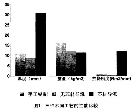 與傳統工藝相比,真空芯材導流工藝將夾芯復合材料的所有優點與閉式壓模在工藝、性能以及衛生保健與安全保障方面的優勢出色地結合在一起。采用夾芯結構與FRP單板結構、鋁材、鋼材相比, 在保持強度的同時明顯減輕了重量、增加了剛度,在基本不增加重量的情況下,通過增加芯材的厚度,獲得更高的強度和剛度;更高的剛度在減少支撐結構同時,進一步減輕重量,見圖1。同時, 閉孔夾芯材料可以起到吸振緩沖、隔音絕熱的作用。采用夾芯結構,給設計帶來更大的自由度,夾芯的復合曲線形狀可易于組合,外部表層可以正確地