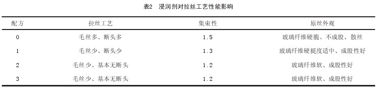 按實驗方案配制浸潤劑,并現場拉絲,研究浸潤劑對拉絲工藝影響。試驗結果如表2。