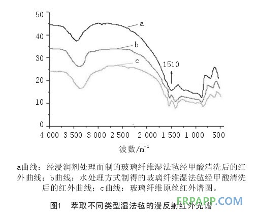 結果分析從圖中發現,水處理的濕法氈玻璃纖維與原絲紅外曲線相似,而經偶聯劑處理而加工的濕法氈樣品經萃取后的玻纖屑紅外光譜在1510cm的位置有一個明顯的峰,通過文獻可知此處對應的是改性樹脂中的酰胺結構,這說明玻璃纖維與改性樹脂的結合不僅僅是物理上的結合,同時也存在由浸潤劑、玻璃纖維以及樹脂粘結劑發生化學反應而產生的結合。這也從微觀上解釋了經浸潤劑處理后濕法氈具有優良的力學性能。