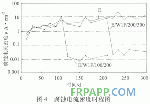 FRP材料在結(jié)構(gòu)加固領(lǐng)域中多用于損傷結(jié)構(gòu)的加固,F(xiàn)RP加固腐蝕損傷結(jié)構(gòu)的抗腐蝕性能是工程界非常關(guān)注的問(wèn)題。Pantazopoulou、Ahmed S和Neale等對(duì)FRP加固腐蝕損傷柱的耐腐蝕性能做了研究。Ahmed S研究了碳纖維布加固圓形柱的耐腐蝕性能,試件直徑為152mm、高為304mm,縱向配有4根M10鋼筋(直徑為11.3mm),橫向螺旋箍筋為M5級(jí)(直徑為3.9mm),間距為50mm,試驗(yàn)分別通過(guò)加速電流腐蝕和加速自然腐蝕使鋼筋銹蝕,根據(jù)直流線性極化電阻法測(cè)得了加速自然腐蝕試驗(yàn)中試件鋼筋的腐蝕電流密度icorr,得到了腐蝕電流密度時(shí)程圖icorr-t。圖4為Ahmed S通過(guò)加速自然腐蝕所獲得的3個(gè)典型試件的時(shí)程圖,E代表試件未經(jīng)加固進(jìn)行加速自然腐蝕。E/WlF/100/200為在加速自然腐蝕100d后,用FRP把整個(gè)柱身加固起來(lái),然后繼續(xù)腐蝕到200d;E/WlF/200/300為在加速自然腐蝕200d后,用FRP把整個(gè)柱身加固起來(lái),然后繼續(xù)腐蝕到300d。由圖4可以看出,加固后試件的腐蝕電流密度下降到了原來(lái)的1/1000左右,表明FRP加固已腐蝕的試件具有很好的耐腐蝕保護(hù)特性。
