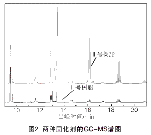 低粘度樹脂的固化劑為多種胺類固化劑的混合物,且為非通用的標準物質。固化劑大分子在進入氣相色譜儀后裂解生成小分子,氣-質聯用儀器分析法不能通過標準譜庫準確地一一剖析每種胺類固化劑中的組分,但是可以通過對比不同材料的出峰時間來分析材料之間的成分的差異。圖2是兩種固化劑的GC-MS譜圖,可以看出兩種固化劑的出峰時間基本相同,只是在13min左右處略有不同。說明Ⅰ號樹脂用固化劑和Ⅱ號樹脂用固化劑的組成基本相同,只是個別組分的用量稍有不同。