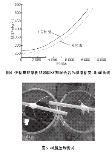 圖4是將低粘度環氧樹脂和固化劑混合后的樹脂粘度-時間曲線??梢钥闯?,Ⅰ號樹脂的初始粘度較Ⅱ號樹脂高,且兩款樹脂的升溫速率相當。為了測試生產中的實際升溫速率,在室溫為26℃的條件下,對比Ⅰ號樹脂和Ⅱ號樹脂各40kg混配物的溫度隨時間的變化情況(圖5),采用熱電偶溫度計(分度為1.0℃)測試兩桶樹脂的升溫速率并進行記錄(圖6)??梢钥闯?,Ⅰ號樹脂和Ⅱ號樹脂的實際升溫速率基本一致。