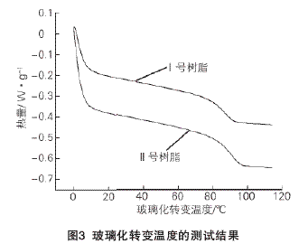 圖3是兩種低粘度環氧樹脂玻璃化轉變溫度(Tg)的測試結果。通過測試軟件模擬得出Ⅰ號樹脂的Tg為91.38℃、Ⅱ號樹脂的Tg為95.30℃。前面的GC-MS分析結果表明,兩種低粘度環氧樹脂中均含有異氟爾酮二胺(IPDA),該物質是調節固化后樹脂玻璃化轉變溫度的主要成分,同時也會對樹脂的力學性能產生影響。Ⅱ號樹脂的Tg偏高,說明Ⅱ號樹脂的IPDA用量略高于Ⅰ號樹脂。IPDA中含有剛性基團,用量增加會提高樹脂的剛度,Tg的測試結果與斷裂延伸率和沖擊強度的測試結果吻合,這是Ⅰ號樹脂的性能好于Ⅱ號樹脂的原因之一。
