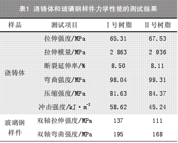 固化后的樹脂作為復合材料基體的主要作用是與纖維復合后形成復合材料。當復合材料受到外力時,通過樹脂基體的變形可以均勻地將應力傳遞到每根纖維增強體上,從而滿足復合材料的使用要求。只有樹脂能很好地浸潤纖維,才能確保復合材料的整體優勢得以體現。玻璃鋼樣件的縱、橫剪切強度和彎曲強度等宏觀性能可以間接地反映樹脂和纖維間的界面結合情況。表1中雙軸玻璃鋼樣件拉伸強度和彎曲強度的測試結果表明,由Ⅰ號樹脂制備的玻璃鋼層合板的雙軸縱、橫剪切強度和彎曲強度等力學性能值均高于Ⅱ號樹脂制作的玻璃鋼層合板,說明Ⅰ號樹脂與纖維的界面結合性能優于Ⅱ號樹脂與玻纖的結合性能。