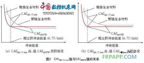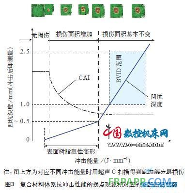 根據上述分析,從進步壓縮設計值的角度考慮,對材料性能的要求是含BVID時具有較高的CAI值。文獻[7]~[9]通過大量的試驗研究發現,含沖擊損傷層壓板的壓縮破壞機理是沖擊損傷四周在加載過程中會出現一特征損傷區,當該區內0°纖維均勻應力達到單向板的壓縮強度時出現破壞,提出可將沖擊損傷區簡化為長軸與損傷寬度相同的橢圓孔,然后采用損傷區纖維斷裂(FD)失效判據來進行估算,該失效判據為:當缺口(或損傷)四周特征長度l0范圍內0°層的均勻軸向應力達到單向板的極限強度時,含損傷層壓板出現破壞。固然該估算方法有一定局限性,但可以說明含BVID層壓板的CAI值與沖擊損傷的面積(或寬度)、復合材料體系的特征尺寸和單向板的壓縮強度有關,因此高損傷容限復合材料體系的研制應從這幾方面著手,特別是盡可能減少BVID時的損傷面積(寬度)。文獻[10]和[11]對沖擊損傷隨沖擊能量增加的擴展規律進行了研究,發現復合材料層壓板的抗沖擊行為呈現有明顯的拐點現象,圖3給出了對應于不同的沖擊能量,作為損傷阻抗標志的凹坑深度和作為損傷容限標志的CAI值的變化規律,同時給出了不同沖擊能量對應的內部損傷狀態。隨沖擊能量的增加其凹坑深度、內部分層損傷狀態和壓縮強度的變化規律是當沖擊能量較小時,沒有凹坑,同時內部沒有損傷;能量增加后可以檢測到凹坑,但深度很淺,目視基本不可見,表明表面樹脂出現了塑性,但內部仍無損傷,同時壓縮強度沒有降低;繼續增加能量,凹坑深度不斷增加(通常仍比較淺),內部開始出現分層損傷,此時壓縮強度開始下降;繼續增加能量,凹坑深度也不斷增加,同時壓縮強度急劇下降;在沖擊能量超過某個值后,凹坑深度(大約為0.5mm)隨能量增加而急劇增加,很快達到了BVID的要求,并可以觀察到沖擊部位表面纖維斷裂,但內部分層損傷面積基本上不再增加,同時其CAI值也基本上不再降低。作者用熱揭層的方法對拐點前后的損傷狀態進行了研究,發現拐點現象的本質是其損傷機理發生了突變,即由單純的基體裂紋和分層到出現沖擊部位表面纖維斷裂,一旦表面纖維開始斷裂,內部的分層區域基本上不再增加,其后續的損傷機理是從表面到內部的纖維斷裂。由于出現拐點時的內部損傷尺寸基本上代表了含BVID試樣可能存在的損傷尺寸,而損傷尺寸決定了CAI值,因此可以通過對影響損傷擴展和控制表面纖維斷裂的因素分析,來確定研制高損傷容限復合材料體系的途徑??刂乒拯c時損傷尺寸的因素有以下幾點:(1)降低樹脂從分層起始到表面纖維出現斷裂期間的層間分層擴展速率;(2)使拐點盡早出現,即盡早達到纖維的斷裂應變。為此有2種途徑:使沖擊部位的樹脂盡早進進塑性,從而增大局部的纖維應變;采用斷裂應變較低的纖維。