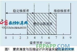 根據這樣的設計準則,控制機翼蒙皮部位的設計約束主要是穩定性要求(結構厚度小于4mm時)和損傷容限要求(結構厚度約3~7mm時),較厚蒙皮結構的設計約束是維修性要求(結構厚度大于6mm時),此外機械連接部位的設計約束是靜強度要求,因此機翼結構的減重主要取決于穩定性和損傷容限要求,對第二代復合材料體系的性能要求也主要圍繞這2個方面來考慮。對穩定性要求,目標是進步蒙皮壁板的初始屈曲載荷,而從材料性能角度,最簡單的方法是進步復合材料體系的模量,因此國外飛機機翼上的蒙皮一般采用模量約300GPa的碳纖維(如IM系列或T800等)。對損傷容限要求,目標是進步壓縮設計許用值,而從材料性能角度是進步復合材料體系的抗沖擊性能。圖1為結構蒙皮厚度與壓縮設計許用值關鍵因素的關系。