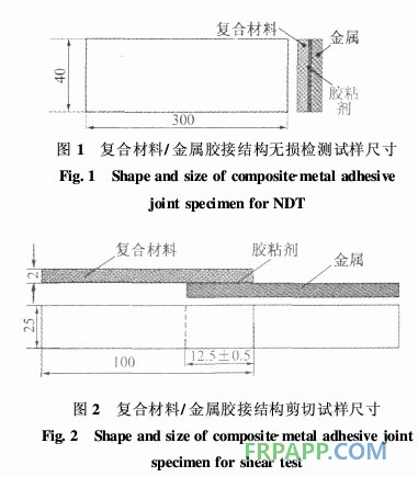 試驗(yàn)材料為T700碳纖維/環(huán)氧樹脂基和T300碳纖維/環(huán)氧樹脂基預(yù)浸帶制成的復(fù)合材料試板,其中兩種碳纖維的體積分?jǐn)?shù)名義值均為60%。分別按ASTMD3039,ASTMD6641,ASTMD790,ASTMD2344,ASTMD3518和ASTMD1002-2005的要求加工出縱向和橫向拉伸試樣、縱向和橫向壓縮試樣、縱橫剪切試樣、彎曲試樣、層間剪切試樣以及復(fù)合材料/金屬膠接結(jié)構(gòu)剪切試樣。其中,復(fù)合材料/金屬膠接結(jié)構(gòu)無損檢測(cè)試樣的幾何形狀及尺寸見圖1,剪切試樣的幾何形狀及尺寸見圖2。