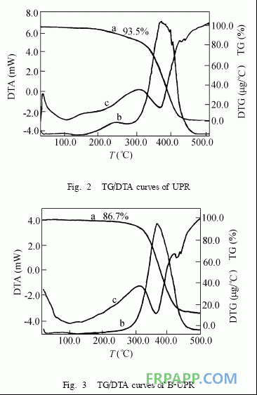 圖2和圖3分別是光固化的UPR和B2UPR的熱重差熱圖譜。安息香乙醚加量為1%,光照時(shí)間1h。曲線a、b是熱失重(TG)曲線和微分熱失重(DTG)曲線,B-UPR的總熱失重為86.7wt%,低于UPR(93.5wt%)。并且B-UPR熱失重的起始溫度為180℃,提高了30℃(UPR的起始溫度為150℃)。B-UPR的DTG有一個(gè)峰出現(xiàn)在374℃,而UPR出現(xiàn)兩個(gè)峰,分別在240℃和372℃左右。由此可見,UP/PER嵌段共聚樹脂的熱穩(wěn)定性好于純的UPR。