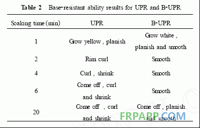 UPR的耐堿性與其化學(xué)結(jié)構(gòu)有關(guān)。酯鍵的密度和類型、端羧基的量及交聯(lián)度等因素決定了樹脂的耐堿性。按UP-PER-UP結(jié)構(gòu)計(jì)算,B-UPR的酯鍵密度比UPR減少了17%左右。按酸值計(jì),端羧基的個(gè)數(shù)減少了70%~80%,所以耐堿性得以顯著提高。此外,結(jié)合表1可以看出,隨光照時(shí)間的長(zhǎng)短和引發(fā)劑的量的多少,其耐堿性也有區(qū)別。