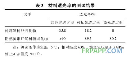 (7)阻燃抑煙劑聚磷酰氰胺脲的加入可大幅度降低環氧樹脂的發煙量,使其紅外光透過率由純樹脂的 35.8%提高至 90%以上,可見光透過率由純樹脂的 18.2%提高至 89.3%,激光透過率由純樹脂的 0提高至 80.2%。
