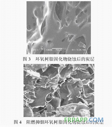 (3)電鏡照片顯示,阻燃抑煙劑聚磷酰氰胺脲的加入可使環氧樹脂燒蝕后的膨脹炭層由蜂窩狀結構變為石墨片層狀結構,因而具有優異的阻燃、抑煙性能。