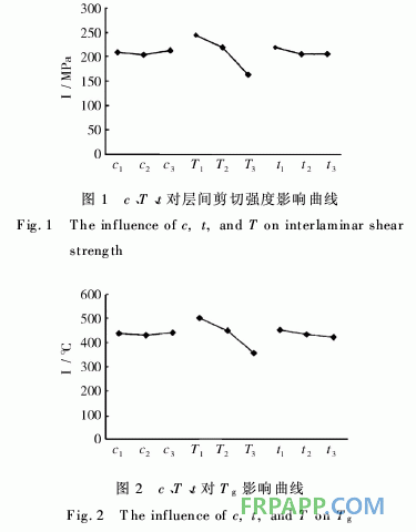 將所得各組試樣的層間剪切強(qiáng)度值和玻璃化轉(zhuǎn)變溫度值填入正交表,計(jì)算出相關(guān)項(xiàng)(水平1、2、3分別對(duì)應(yīng)的目標(biāo)函數(shù)及其相應(yīng)的極差),見表2。