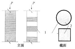 圖3 混凝土受壓構件的加固 1—粘貼的碳纖維布;2—混凝土柱體