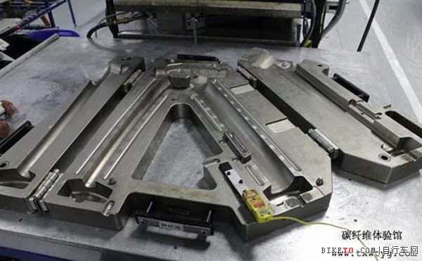 一些比較大的結(jié)構(gòu)體,比如立管的連接處,就要將碳布一片一片地貼在模具里。工廠里有許多教具供工人實習(xí),確保在實際的生產(chǎn)過程中,每一片碳布都能完美地貼合在相應(yīng)的位置。圖中就是一個連接車架上管、頭管和下管的模具。