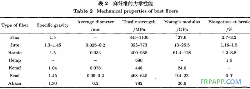 按照從其植物本體抽取部位的不同來定義區(qū)分,各類麻纖維包括一年生或多年生草本雙葉子植物皮層的韌皮纖維和單子葉植物的葉纖維.韌皮纖維主要有苧麻(Ramie)、亞麻(Flax)、黃麻(Jute)、大麻(Hemp)和洋麻(Kenaf)等;葉纖維則包括劍麻(Sisa1)和蕉麻(Abaca)等.其中黃麻和洋麻等韌皮纖維胞壁木質化,纖維短,多用于紡制繩索和包裝用麻袋等;亞麻等胞壁不木質化,纖維的粗細長短同棉纖維相近,廣泛用于紡織原料等;葉纖維則比韌皮纖維粗硬,主要用于麻繩、麻袋和手工藝品等。麻纖維具有獨特的微觀結構,表現(xiàn)出典型的復合材料特征.不同種類的麻纖維其細胞長度和寬度分布在5—50mm和20—50 m;其橫截面為有中空腔的腰圓形或多角形,縱向有橫節(jié)和豎紋.各類麻纖維主要由纖維素、半纖維素、木質素、果膠等組成,其化學成分組成和結構參數列于(表1).麻纖維因其組成和結構特點以及連續(xù)長度較長等原因,具有良好的力學性能和可加工性(表2),但是其力學性能則因其生長條件、抽取部位和種植時間不同而不同.
