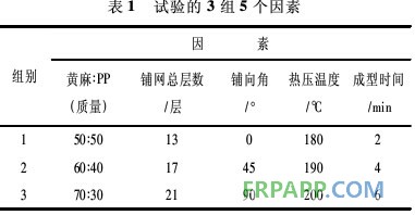 (1)黃麻纖維:工藝纖維的線密度為3.33~1.67 tex,長度3.5~290mm,含短絨(<25 cm),麻屑、并絲、麻粒及其他雜質約21.1%。(2)聚丙烯(PP)纖維:線密度1.5 dtex,長度40 mm,熔點168℃,密度0.89 g/cm3,單纖維強度485 mN/tex,斷裂伸長28%。