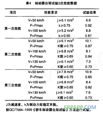 使用玄武巖短切纖維為主增強(qiáng)纖維制作的B01系列制動(dòng)鉗摩擦襯塊在臺(tái)架試驗(yàn)中也顯示出優(yōu)良的性能。表4為轎車制動(dòng)器臺(tái)架試驗(yàn)中試樣的效能數(shù)據(jù)。結(jié)果表明3次效能檢測(cè)的減速度J和制動(dòng)力矩穩(wěn)定系數(shù)K值都達(dá)到了規(guī)定的要求。另外,第一次和第二次衰退和恢復(fù)試驗(yàn)結(jié)果也遠(yuǎn)遠(yuǎn)好于性能指標(biāo)值的要求。