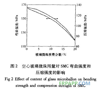 快的原因在于:玻璃纖維對壓縮強度的支持小于彎曲強度,造成壓縮強度更迅速下降。由此可見,如果要求SMC在密度降低的條件下還要有較好的力學性能,玻璃微珠質量分數以不超過10%為宜。