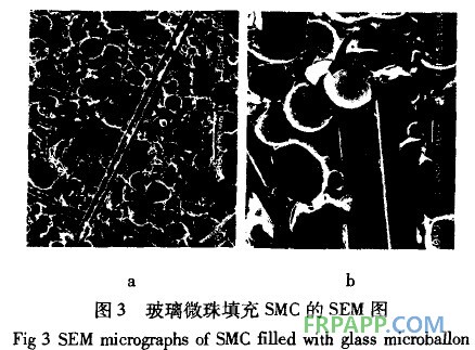 圖3是玻璃微珠填充SMC的SEM圖。由圖3a可以看出,SMC體系中纖維是以無序形式存在,玻璃微珠質量分數達到20%時,體積填充量已經比較高,微珠與微珠之間的距離比較小,有些球已經互相接觸。從斷面破壞情況看,纖維未受到破壞,主要是以微珠破裂形式出現,原因是微珠壁薄,與纖維相比強度要低的多,受力會首先產生破壞,由此也可解釋微珠用量越高,SMC力學強度越低的現象。由圖3b可以看出,纖維附近與纖維接觸的許多微珠出現變形破裂,應該有一部分是在模壓過程中,纖維流動對微珠擠壓造成的破裂,因此,降低模壓壓力應該能夠降低微珠的破損率,對SMC的低密度性能有利。
