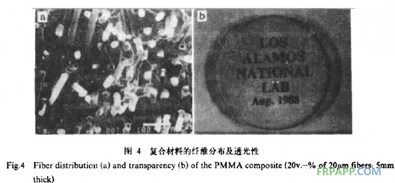 采用適當的制備工藝,嚴格控制纖維基體界面,。并使纖維有效均勻地分散干基體中,當基體與纖維的折光率相近時,可以制備出透明復合材料。圖4a示出20v.-%纖維含量的PMMA復合材料的斷口顯微結構,可以看出纖維分布均勻且纖維與基體結合緊密。圖4b示出5mm厚20v.-%纖維含量的PMMA-BKIO纖維復合材料樣品,其光學透明性非常明顯,該試樣可見光透過率約為78%。這便給復合材料的應用提出了一個新的課題。
