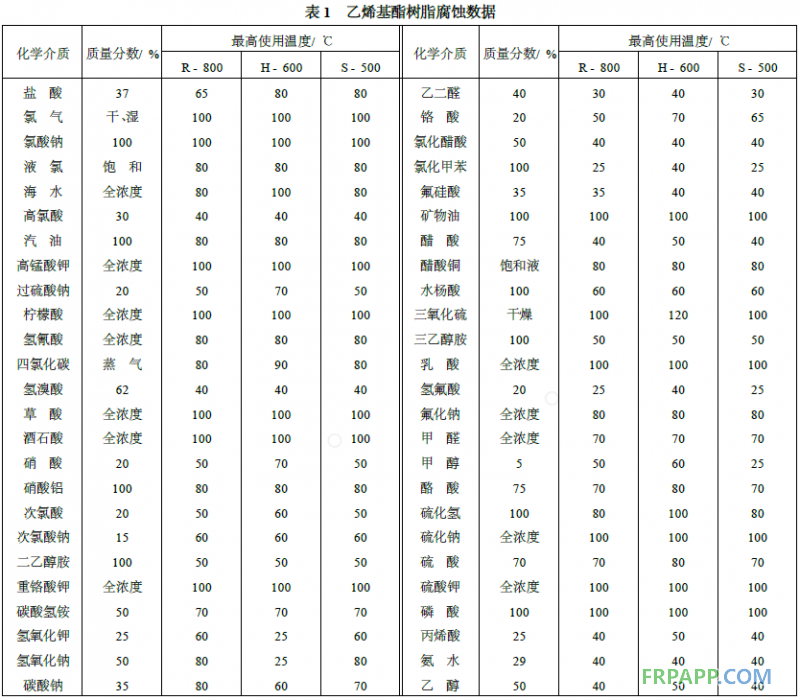 日本昭和高分子株式會社,是世界上最早生產(chǎn)乙烯基酯樹脂的公司之一,對乙烯基酯樹脂進行了500多種化學(xué)介質(zhì)的腐蝕測試。現(xiàn)將部分?jǐn)?shù)據(jù)摘錄如表1。表中R- 800為高耐腐蝕型:H- 600為高耐腐蝕、耐氧化、耐熱、耐溶劑型;S- 500為高耐腐蝕、難燃型。