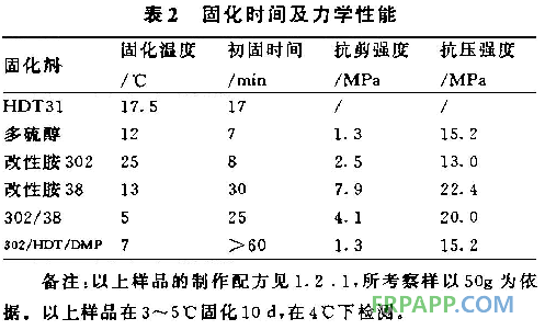 由于要選擇低溫型的固化劑,一些常溫下反應活性較強的固化劑,在低溫下(10℃)活性較低,因而對環氧樹脂的固化變得很難,特別是在接近0℃時,有些固化劑就基本上停滯了反應。當然,在超低溫下的固化研究工作已經有人開展了,只是沒有形成一個系統。本文僅限于10°C以下(0°C以上)的環氧樹脂固化劑的應用作了一些研究。表2為低溫固化時間與低溫下的抗剪與抗壓強度。