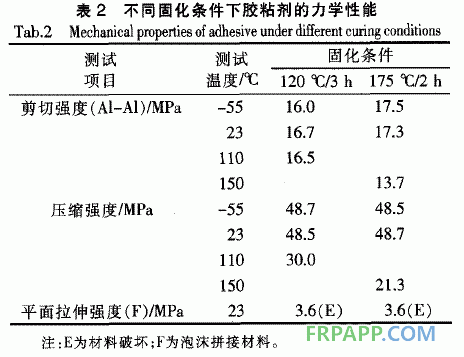 本研究研制的低密度糊狀膠粘劑具有與中溫或高溫EP預浸料共固化的特性,其不同固化條件時的力學性能如表2所示。