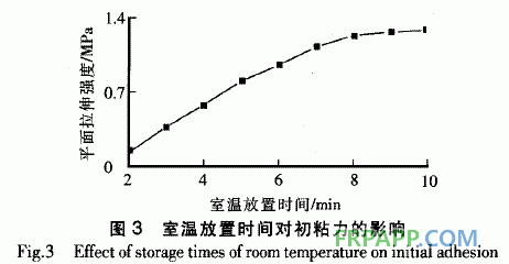 由圖3可知:該膠粘劑的室溫(25 oC)放置時間越長,PMI泡沫拼接材料的初粘力(平面拉伸強度)越大;當室溫放置時間≥8 h時,初粘力增幅趨緩。綜合考慮,選擇室溫放置時間為8 h時較適宜。
